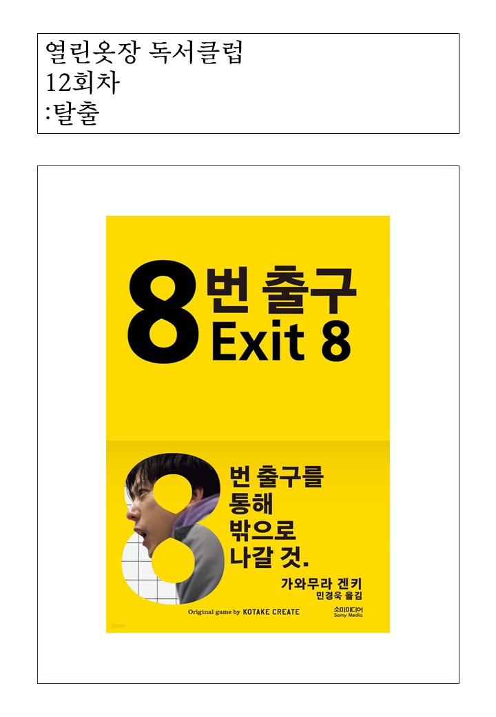 내가 8번 출구를 이번 독서모임 책으로 고른 이유는 단순히 눈에 띄었기 때문이다. 오랜만에 들른 서점 신간 코너에서 유독 샛노랑 색 커버가 잘 보였다. 스쳐 지나가면서 영화 광고 영상을 봤던 것 같았다. 내용은 모르지만 웃는 아저씨가 소름 돋게 인상 깊어서 영화를 볼까 고민하고 있었다. 올해 마지막 독서모임은 색다른 장르를 선택하고 싶었던 터라 마침 잘 됐다고 생각했다. 게임이 원작인 소설이라니. 소설에 이어 영화까지 개봉되다니. 화제가 될 정도이니 어느 정도 스토리와 연출이 좋을 것이라 짐작할 수 있었다. 책을 구매한 후 돌아가는 길에 영화 상영관과 게임 구매처를 검색했다.