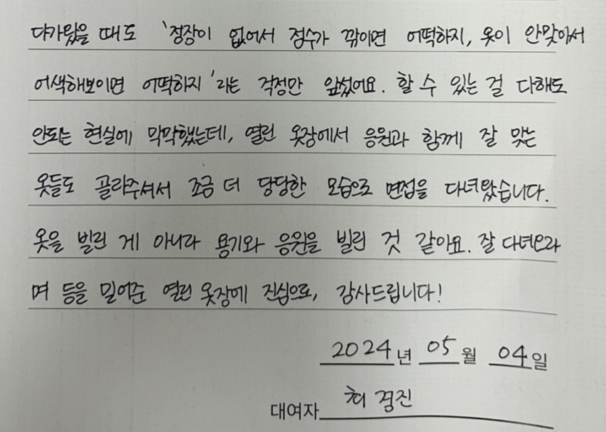 박경철 씨도 그랬을 것이다. 너무 바쁜 하루를 살다보면 환자 한 분 한 분에게도 입원하기 전에 찬란한 인생이 있다는 것을, 그들을 너무나도 걱정하고, 사랑하는 가족들이 있다는 것을 잊을 때가 있다. 나 역시도 그렇다. 이 면접을 보기 위해 한 달 아니 1년, 2년을 치열하게 준비하셨다는 사실을 잊지 않기 위해 매일 출근하여 옷매무새를 다듬으며 되새김질 하곤 한다. “옷만 빌린 게 아니라 용기와 응원을 빌린 것 같아요”라고 대여자분들은 말씀해주신다. 옷장지기들이 대여자 분들의 노력과 치열을 기억하는 마음이 감히 전달되기 때문이 아닐까 생각한다.